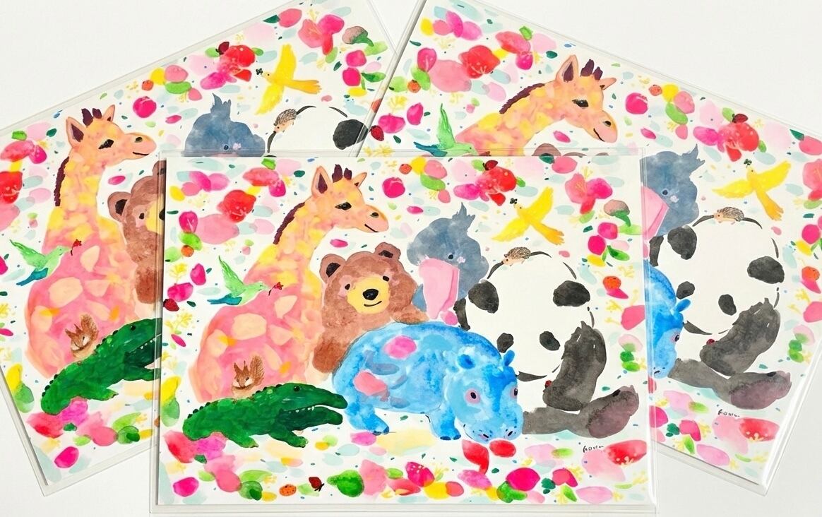たくさんの動物が描かれたポストカードです。