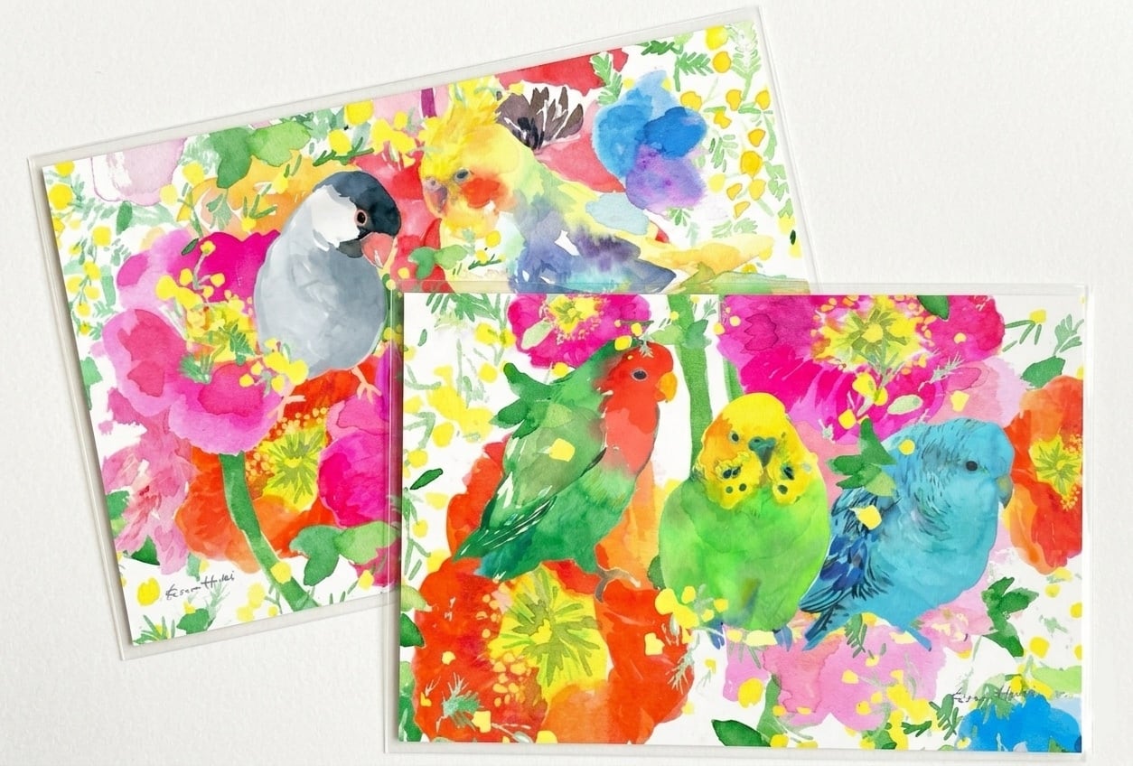 ポストカード-花とインコ-2枚セット